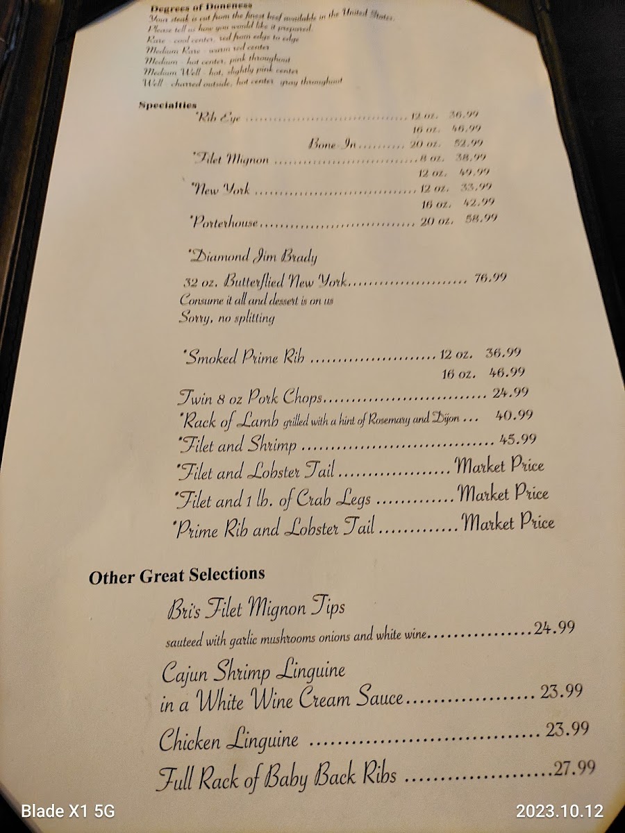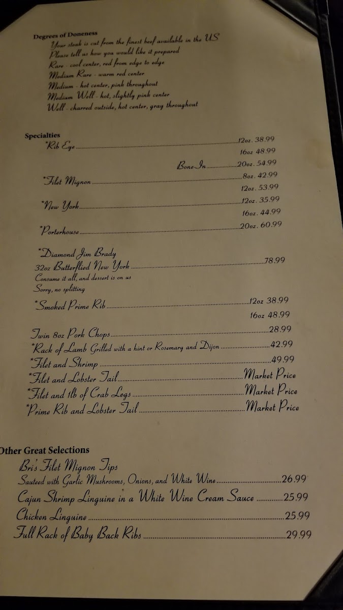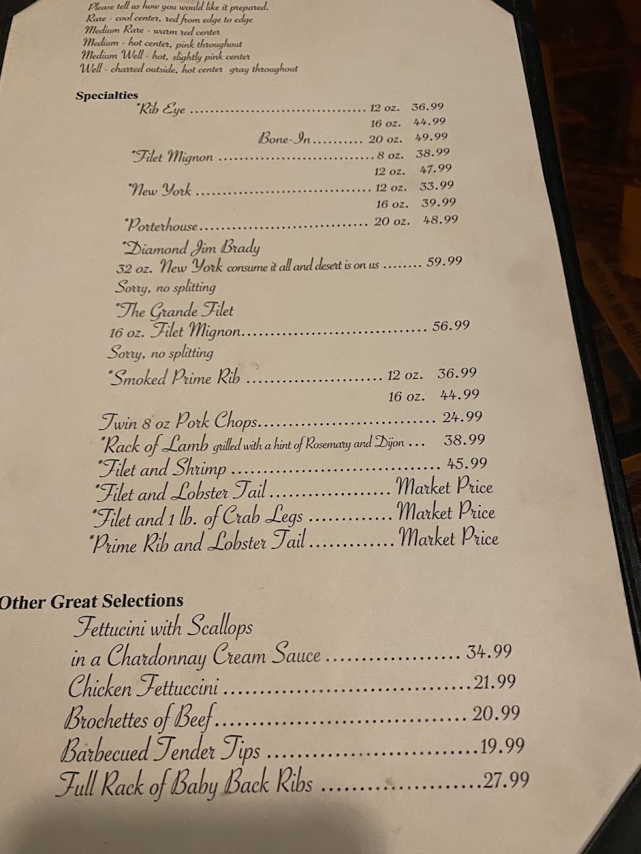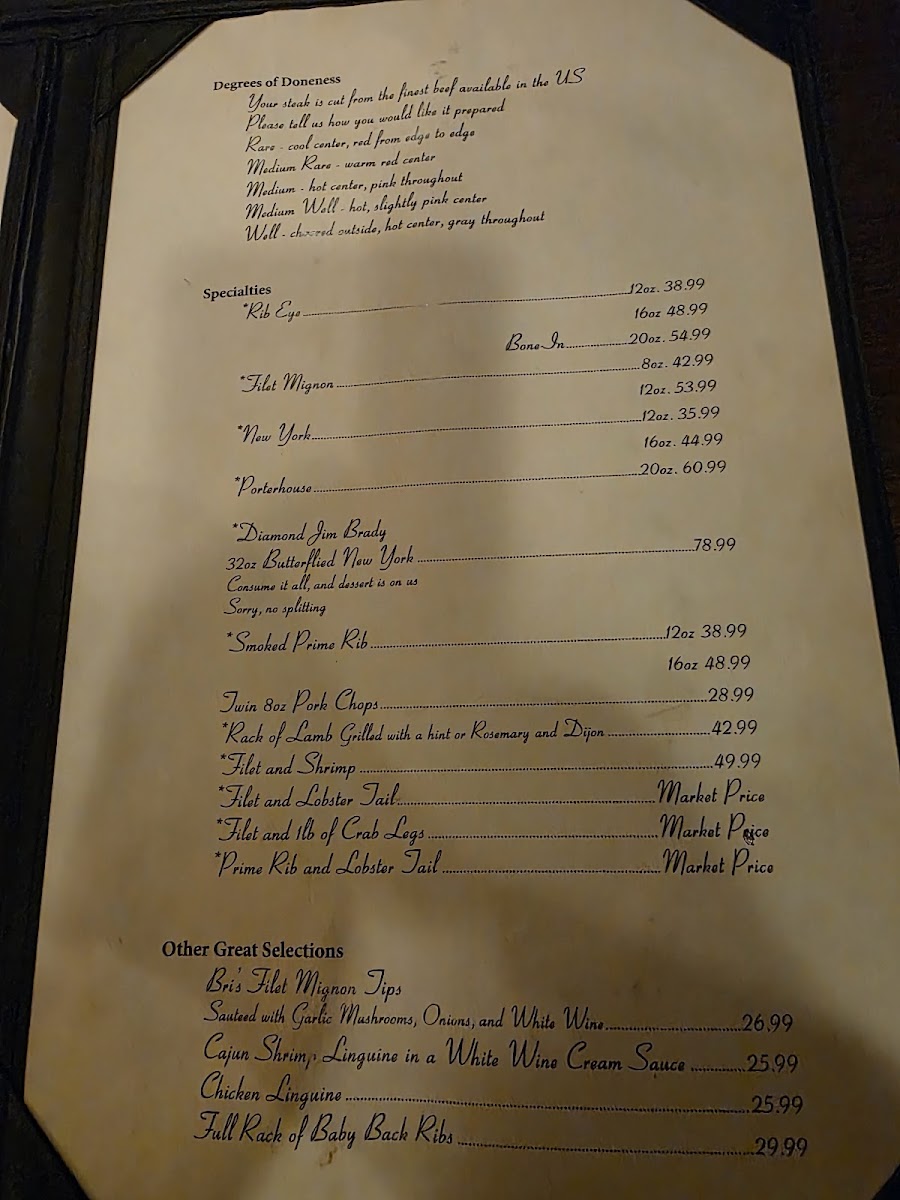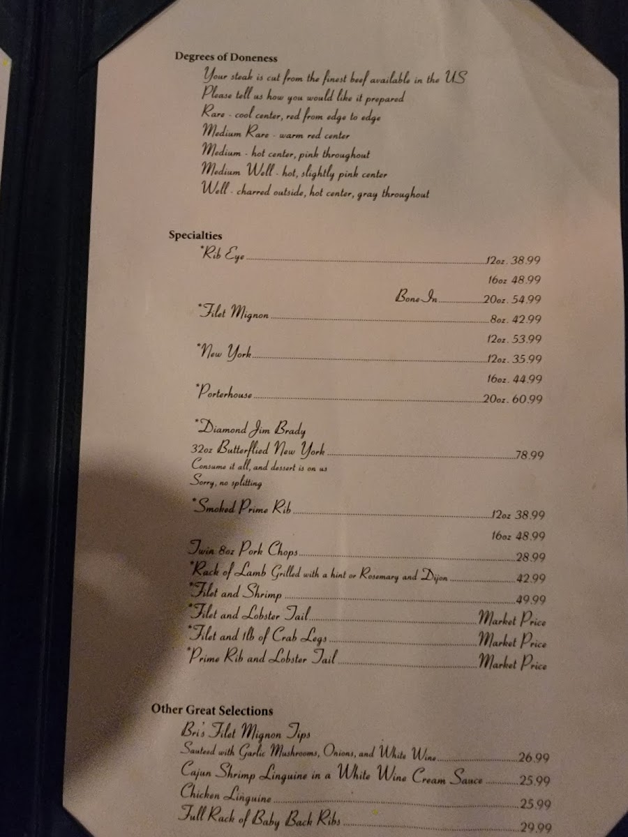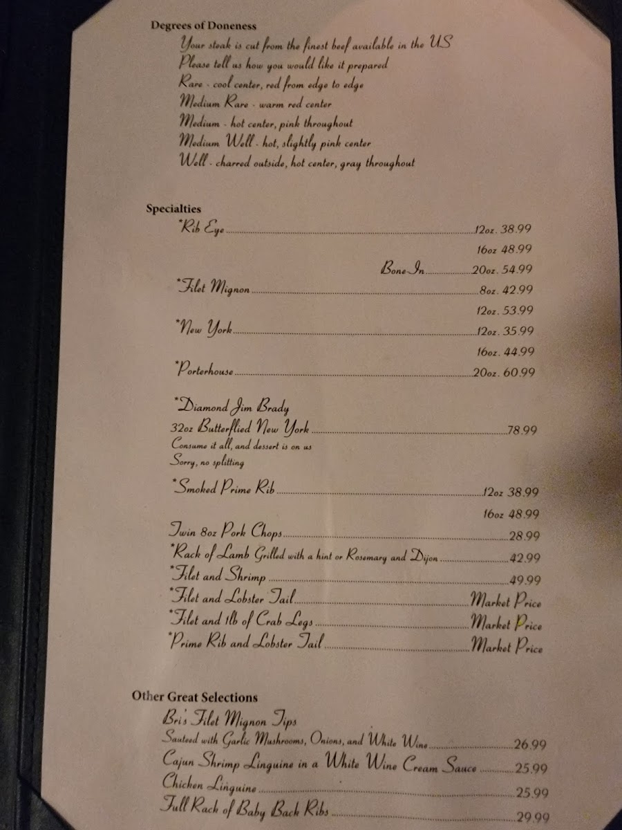Bob Taylor's Ranch House offers a straightforward and satisfying steakhouse menu that emphasizes classic, hearty meals perfect for relaxed dinners and special occasions alike. The menu features carefully prepared cuts of beef, such as New York Strip and Prime Rib, alongside surf-and-turf combinations and fresh seafood options like salmon and sautéed crab cakes.